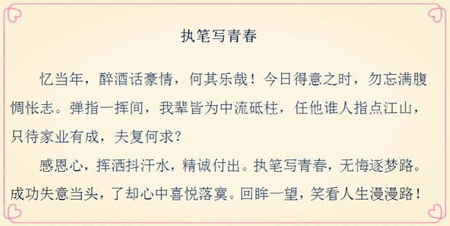 “現(xiàn)在,青春是用來(lái)奮斗的;將來(lái),青春是用來(lái)回憶的?!碑?dāng)所有的經(jīng)歷化作記憶,那些年少時(shí)為理想揮灑的汗水,為成功付出的艱辛,終將成為彌足珍貴的人生財(cái)富。