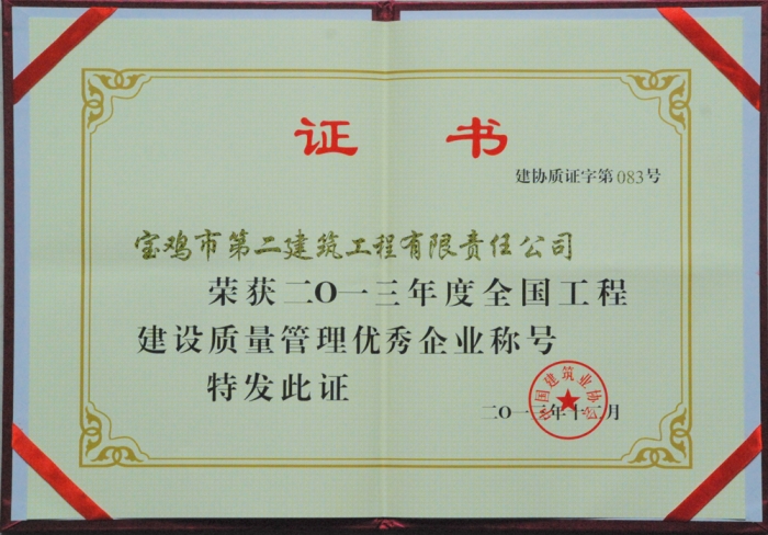 2013年全國工程建設(shè)質(zhì)量管理優(yōu)秀企業(yè)